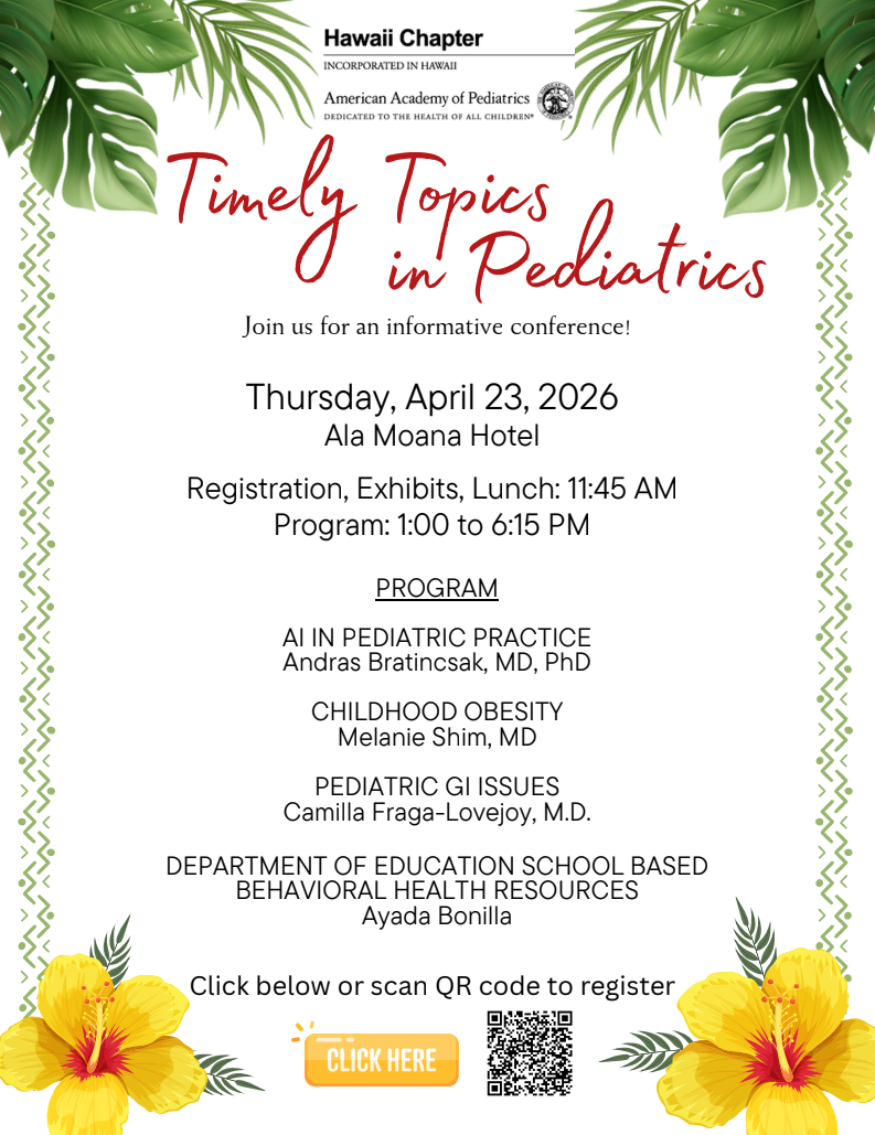 Join us on April 23, 2026, 11:45 am to 6:15 pm at Ala Moana Hotel for Timely Topics in Pediatrics. We have a fun and informative lineup planned including:
